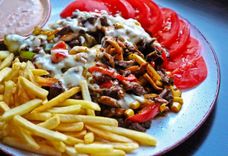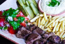 Барбекю из говядины с гарниром из картофеля фри, ливанского салата и хумуса Beef barbeque with French fries, Lebanese salad and humus