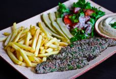 Кафта из говядины с картофелем фри, салатом по-ливански и хумусом Beef kafta with French fries, lebanese salad and humus