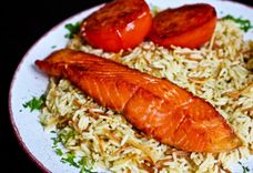 Филе лосося, рис, томат на гриле, лимон Salmon fillet, rice, grilled tomato, lemon